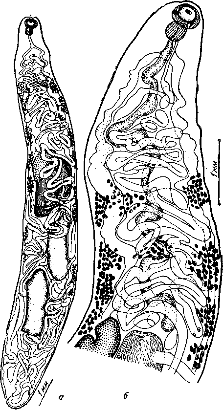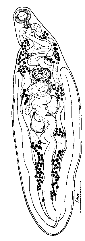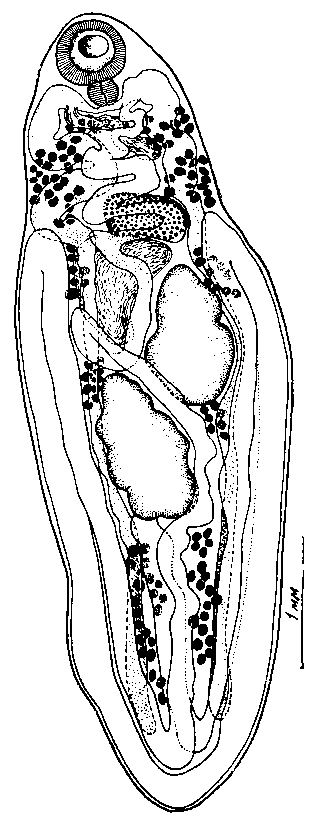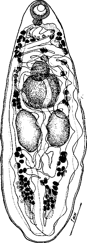 Neohaematoloechus neivai (Travassos et Artigas, 1927) от Leptodactylus pentadactylus labyrinthicus (по Доббину, 1957)
