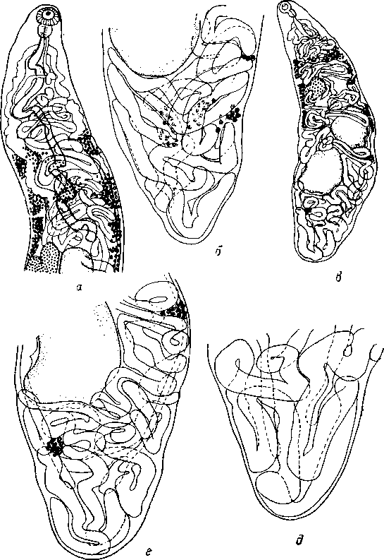 a — передний конец тела; б — задний конец тела; в — общий вид мариты; г, д — задние концы тела