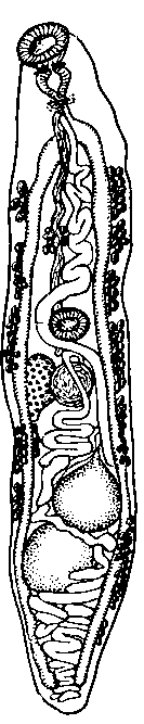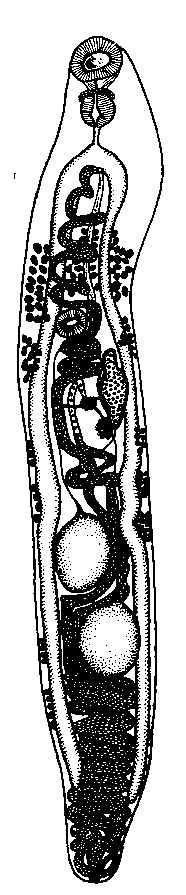 У нескольких экземпляров, однако, от одной до трех групп желточников находились в межкишечном пространстве и впереди брюшной присоски, а также на дорзальной и вентральной поверхностях от кишечных ветвей. Желточных групп несколько больше впереди, в среднем их насчитывается от 9 до 14.