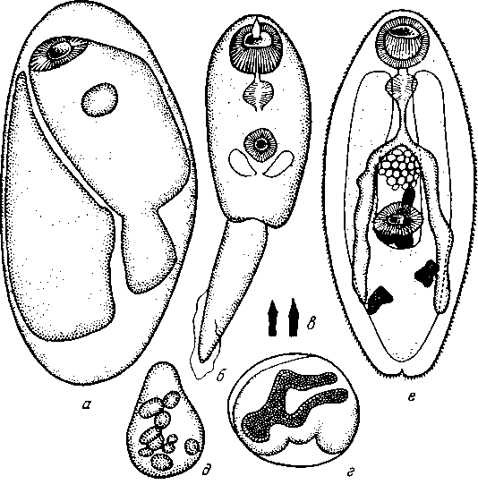 а — спороцнста; б — церкарпй; в — стилет церкария; г — метацеркарий; д — молодые спороцисты; е — морфология метацеркарий