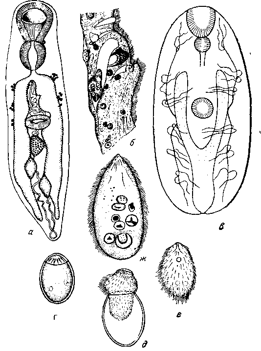а — молодая марита; б — мирацидий в стенке кишечника моллюска Planorbis parvus; в — схема экскреторной системы; г — ж — яйцо и вылупившийся из яйца мирациднй