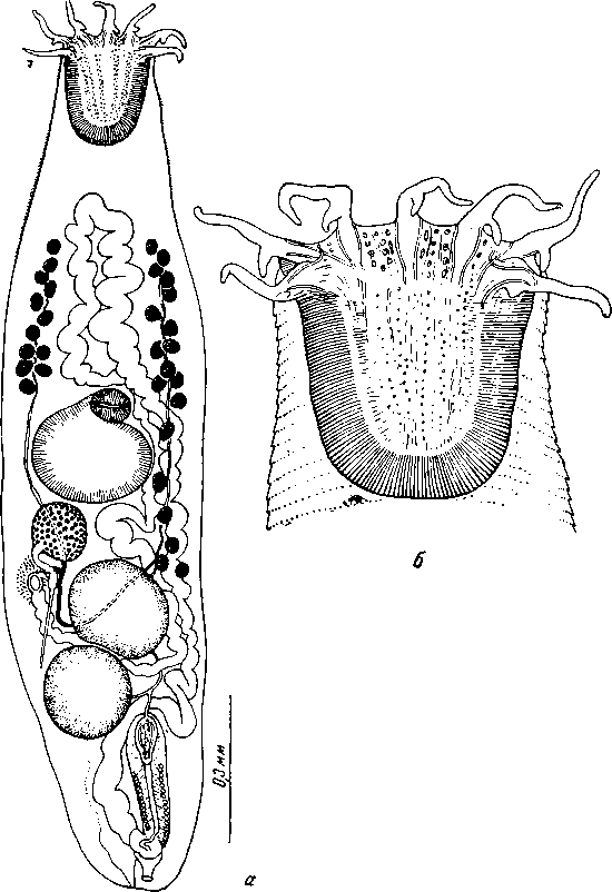 а — общий вид мариты вентрально; б — передний конец тела вентрально