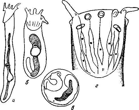 а и б — метацеркарий, извлеченный из цисты; в — метацеркарий в цисте; г — передний конец метацеркария
