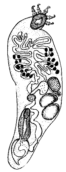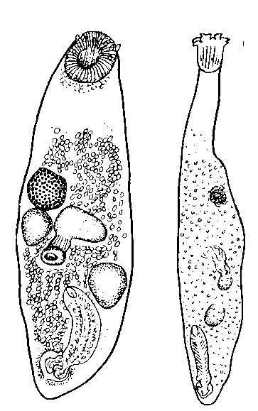 Последний окружен железистыми клетками. Субтерминальное половое отверстие находится на вентральной поверхности, немного впереди заднего конца тела.