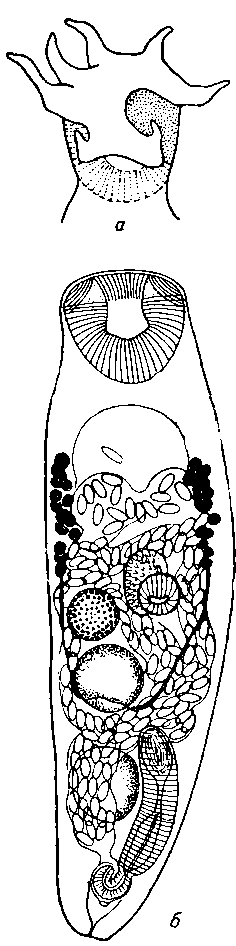 Железистые клетки двух различных размеров сливают свой секрет в два протока, расположенные с вентральной стороны, которые ведут к передней поверхности тела. Большие по размеру клетки, но меньшие числом, расположены в области между мышечными волокнами; они соединены с протоками короткими вторичными трубками. Меньших по размеру клеток числом больше. Большие участки, окруженные паренхимой, расположены в каждой из семи областей между мышечными волокнами и дорзально по отношению к железам. Эти дорзально расположенные участки соединены с семью вытягивающимися щупальцами. Мембрана у основания передней присоски входит в вытягивающиеся щупальца.