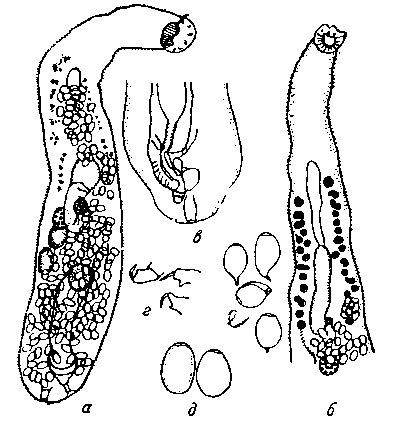 a — общий вид мариты; б — передний конец тела; в — задний конец тела; г — щупальца переднего фиксаторного органа; д, е — яйца