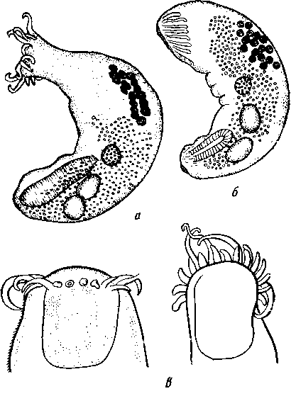 a — марита с вытянутыми щупальцами, длина ее тела 1,65 мм; б — марита со втянутыми щупальцами, длина ее тела 0,6 мм; в — передний фиксаторный орган в разных положениях