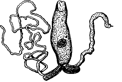Церкарий с одним вытянутым хвостовым концом и вторым — сокращенным