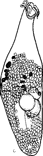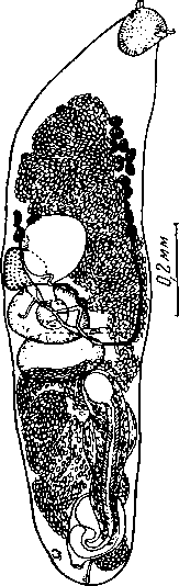 Матка проходит до середины передней трети длины тела или немного дальше вперед; ее главный ствол расположен в зоне желточников и доходит до заднего конца полового атриума. Яйца овальные, с плотной оболочкой, достигают 0,015—0,016 X 0,010— 0,012 мм. Желточники разделены на две симметричные латеральные группы, начинающиеся от середины передней трети длины тела и доходящие почти до середины тела; 16 фолликулов расположены на правой стороне тела и 12 — па левой. Экскреторное отверстие терминальное.