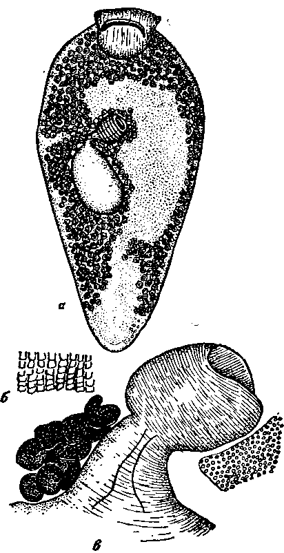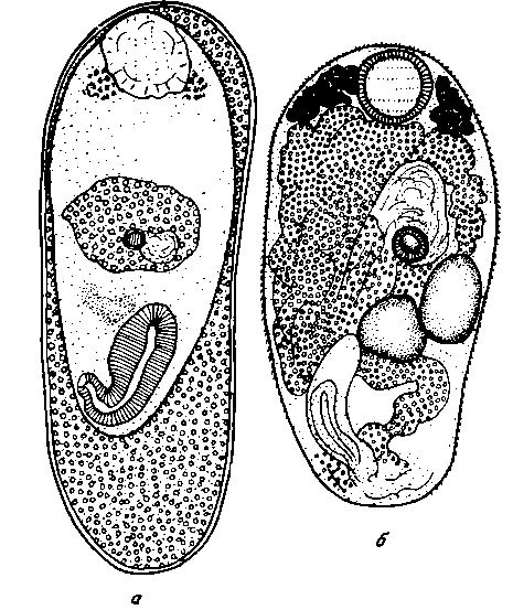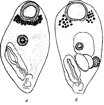 а — циста с незрелым экземпляром и жироподобными шариками из Menidia menidia (длина цисты 1,5 мм); б — марита (длина тела 1,28 мм) из Paralichthys albiguttus