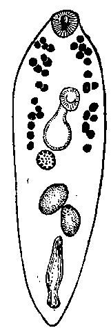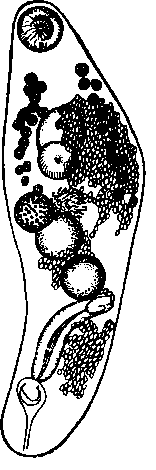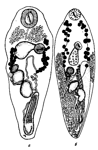 a — метацеркарий из цисты, находившейся в мозговой оболочке Gadus aeglefinus (по Джонстону, 1905, из Дольфю, 1953) б — марита (6 мм) вентрально, из кишечника Lophius piscatorius (по Лебур, 1908 из Дольфю, 1953)
