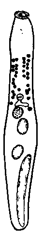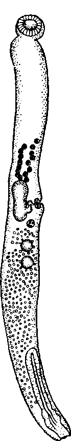 Шейка очень изменчива; она непрерывно сокращается и вытягивается. Тело тонкое, цилиндрическое, изогнутое, длиною 1,28—2,7 мм, постепенно суживающееся к переднему концу, диаметр которого равен 0,01 мм. Задний конец тупо закругленный, 0,14 мм в диаметре; па середине диаметр тела равен 0,21 мм. Тело покрыто мелкими плоскими шипиками, особенно многочисленными в его передней части.