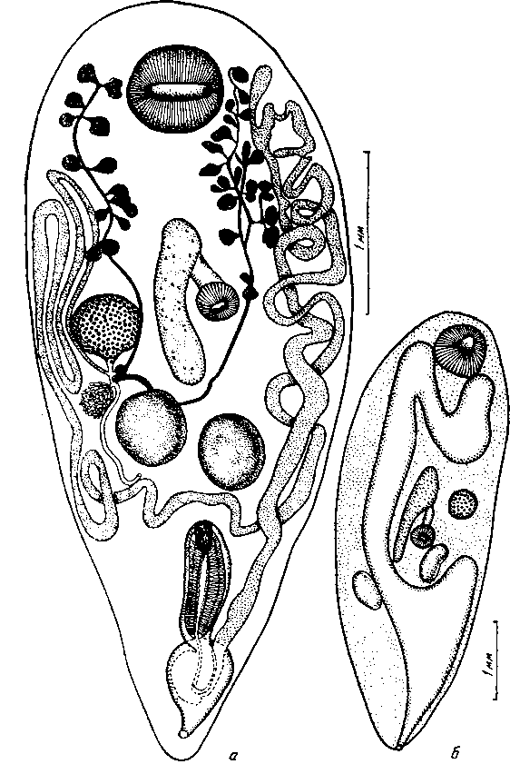 Матка выходит из оотипа в виде узкого протока п описывает петли в правой и левой частях тела, оставляя свободным центральный участок.