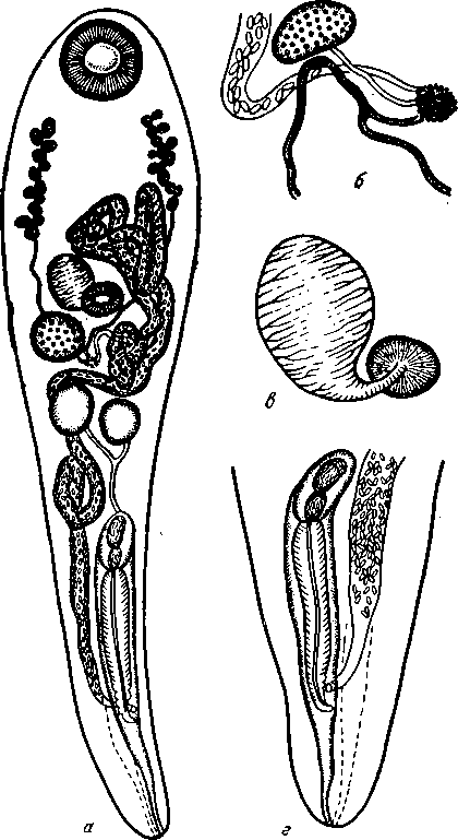 a — общий вид мариты; б — женская половая система; в — фаринкс с кишечником; г'— задний конец тела с половой бурсой