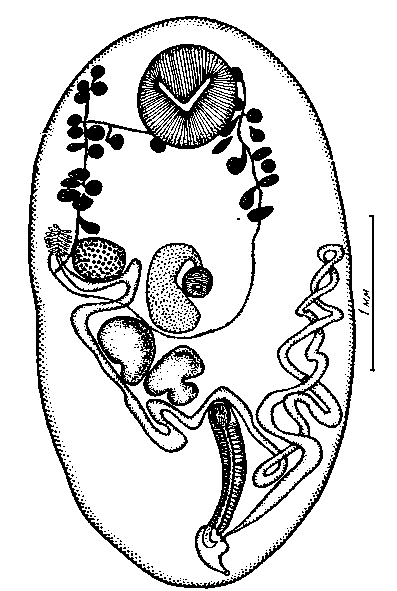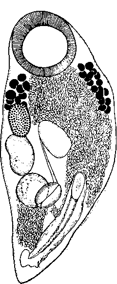 На переднем конце вентральной поверхности расположена хорошо развитая крупная округлая присоска. Она достигает 0,168—0,21 мм в диаметре, т. е. около общей длины тела или немного меньше. Размер этой присоски, являющийся константным признаком всех исследованных паразитов, есть главный признак этого вида.