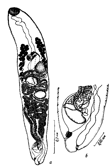 а — общий вид мариты; б — задний конец тела с половой бурсой, латерально.