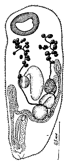 Семенники крупные, овальной формы, расположены наклонно один позади другого на каждой стороне половой бурсы. Передний семенник крупнее заднего, его длина 0,15 мм, ширина 0,21 мм. Он расположен с правой стороны половой бурсы, близко к ротовому отверстию, па расстоянии 0,73 мм от переднего конца тела. Задний семенник находится близко к переднему семеннику с левой стороны половой бурсы; он достигает 0,165 мм в длину и 0,13 мм в ширину, расположен на расстоянии 0,85 мм от переднего конца тела. Половая бурса представляет собой длинный цилиндрический орган длиною 0,73 мм, шириною 0,12 мм. Бурса находится в середине задней области тела; она занимает приблизительно 1/2 длины всего тела.