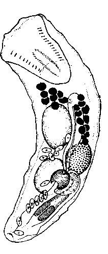 Женские половые органы. Яичник сферический, цельнокрайный, расположен рядом с левой стороной кишечного ствола и немного перекрыт им с дорзальной поверхности.