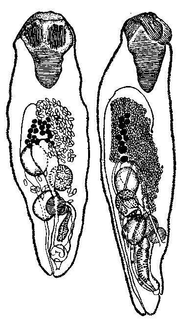 Матка расположена главным образом впереди и содержит сравнительно небольшое число яиц. Впереди она доходит до заднего края хоботка или немного вперед. Она открывается вместе с отверстием мужских половых протоков на заднем конце тела.