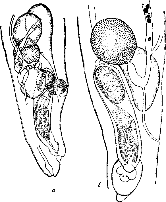 Яичник сферический, немного меньше семенников, расположен с правой стороны, в пространстве между двумя семенниками, если посмотреть па них с дорзальной или вентральной поверхности. Если смотреть с латеральных сторон, то его можно видеть впереди заднего семенника, а его передняя часть перекрывает задний конец переднего семенника. Яичник достигает 0,098—0,101 мм в диаметре.