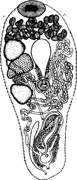 Половой синус, заполненный шарообразной лопастью, 0,09 мм в диаметре; его короткий широкий проток открывается вентрально, на расстоянии 0,03 мм впереди и слегка влево от экскреторного отверстия. Задний конец половой бурсы и половой синус покрыты толстым слоем железистых клеток. Яичник, несколько деформированный под давлением покровного стекла, достигает 0,11 мм в длину при ширине 0,19 мм. Он располагается справа от кишечника, между передним семенником и тельцем Мелиса. Яйцевод, отходящий от левой задней части яичника, направляется прямо кзади, проходя по дорзальной стороне желточного протока и проксимального отдела матки; дойдя до левого края заднего семенника, яйцевод, отделяя лауреров канал, круто поворачивает кпереди, чтобы непосредственно перед вхождением в тельце Мелиса соединиться с общим желточным протоком.