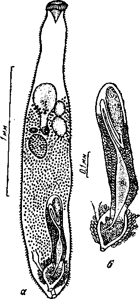 Он овальный, достигает 0,18 X 0,15 мм. Из его переднего конца выходит яйцевод, ведущий в оотип. Клетки тельца Мелиса окружают оотип в виде компактной массы, лежащей непосредственно впереди яичника. Желточники состоят из мелких фолликулов, неравномерно рассеянных по обеим сторонам кишечника, частично закрывая его.