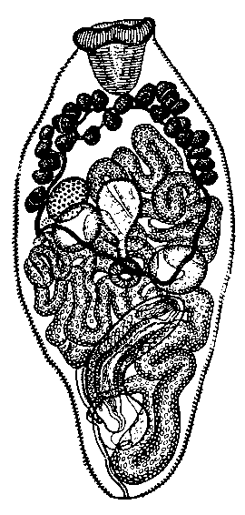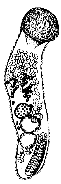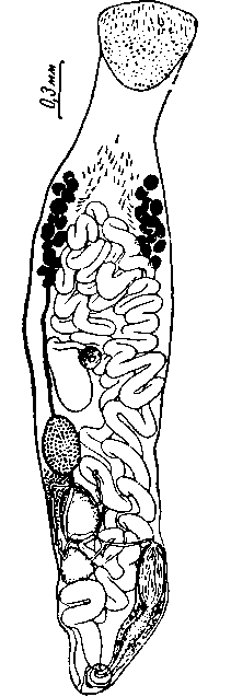 Восходящие петли матки доходят до зоны желточников, после чего поворачивают назад, направляясь к половому отверстию. Яйца эллиптические, с тонкой оболочкой, достигают 0,018 X 0,011—0,012 мм. Желточники образуют две латеральные продольные группы, каждая из которых состоит из 12 фолликулов; они расположены на половине расстояния между передним концом и яичником. Экскреторное отверстие терминальное; экскреторный пузырь трубковидный, широкий, по-видимому, доходит до середины тела.