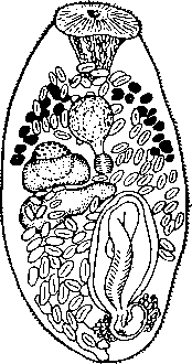 Расположение гонад изменчиво. Яичник находится с правой стороны, немного впереди фаринкса, но перекрывает его и всегда перекрывает передний семенник; яичник обычно расположен целиком дорзально (или вентрально) по отношению к семеннику. Желточники представляют собой две отдельные латеральные группы, простирающиеся от уровня фаринкса до основания хоботка. Обе группы фолликулов соединяются спереди и почти, но не вполне встречаются около основания хоботка. Общее число фолликулов около 23. Матка заполняет большую часть тела, простирается вперед за переднюю границу желточников, перекрывает базальную часть хоботка, сзади достигает уровня полового отверстия. Яйца очень большие по сравнению с размером тела — 0,039— 0,044 X 0,020—0,023 мм.