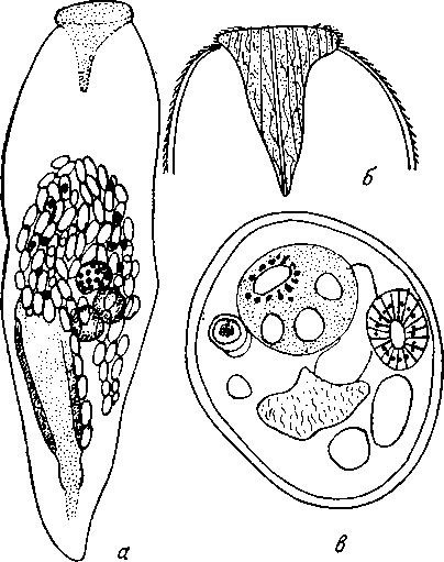 a— общий вид мариты; б — срез через передний конец тела с хоботком; в — поперечный срез тела