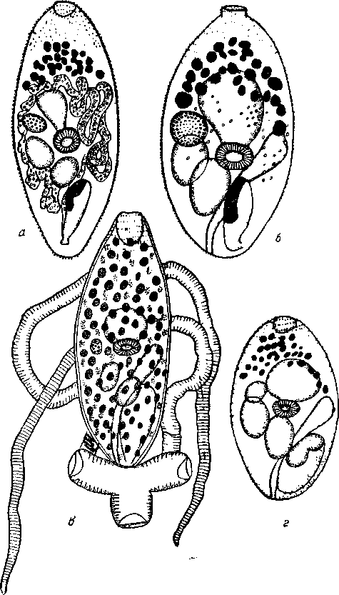 a — общий вид мариты из бычка Myoxocephalus scorpius: б — прогенетический метацеркарий из липариса (Liparis liparis), в —церкарий на мидии (Mytilus edulis); г — молодой метацеркарий из липариса (Liparis liparis)