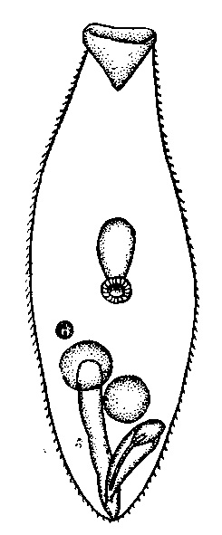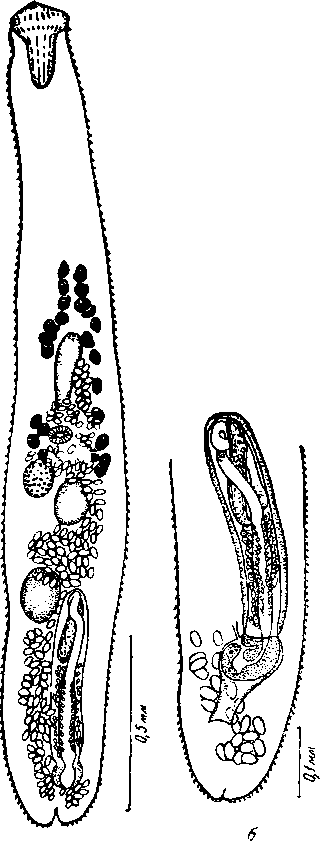 Желточные фолликулы соединяются или почти соединяются, образуя дугу па расстоянии 0,420—0,789 мм от переднего конца тела; отсюда следует, что передняя треть тела или даже несколько) большая его часть свободна от желточных фолликулов. Передняя дуга желточников состоит из 7—8 фолликулов с каждой стороны, а латеральные ряды, тянущиеся назад до уровня яичника, состоят из 11 —17 фолликулов на левой стороне и 11 —16 — на правой, причем фолликулы в этих рядах могут быть несколько разобщенными. Спереди матка несколько не доходит до конца кишечника; однако у одного экземпляра она заходила вперед от кишечника, но никогда не выступала вперед за уровень желточников.