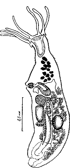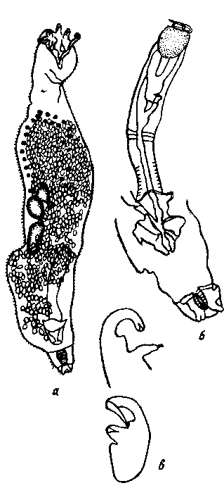 а — общий вид мариты; б — задний конец тела с половой бурсой; в — щупальцы переднего фиксаторного органа
