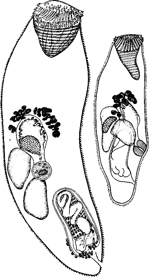 Желточники состоят из небольшого числа отдельных фолликулов, общим числом не более 30. Они достигают 0,009—0,010 X 0,015—0,018 мм. Желточники располагаются в виде арки с вогнутостью, направленной в заднем направлении, в которую входит основание кишечника. Яичник расположен на уровне фаринкса и начального отдела кишечника, которые налегают на него. Он имеет форму овала и достигает 0,063 X 0,048 мм. Семенники неправильной формы, причем длина их превышает ширину.