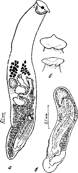 a — общий вид мариты; б — передний фиксаторный орган; в — половая бурса