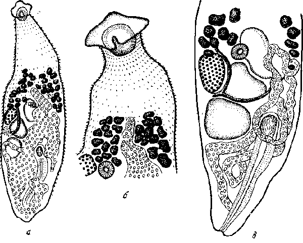 a — общий вид мариты; б — передний конец тела; в — задний конец тела
