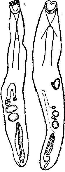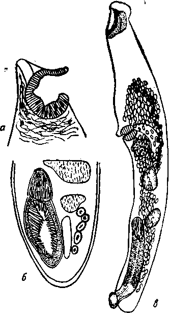 a — продольный срез переднего фиксаторного органа; б — продольный срез заднего конца тела; в — общий вид мариты
