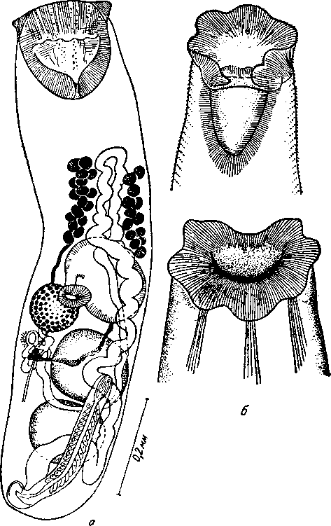 a — общий вид мариты; б — передний конец тела с фиксаторным органом в разных положениях
