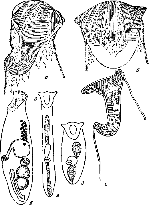 a — срез хоботка (латерально); б — срез хоботка (дорзально); в — марита (латерально); г и д — метацеркарий, извлеченный из цисты; е — продольный срез переднего конца тела метацеркария
