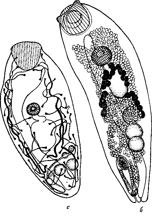 а - метацеркарий с экскреторной системой, из плавника Mugil cephalus; б - половозрелый экземпляр дорзально, из кишечника Lepisosteus spatula.