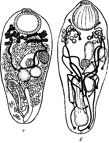 а - половозрелый экземпляр дорзально, из Strongylura marina; б — молодая форма с экскреторной системой, из Menidia sp.