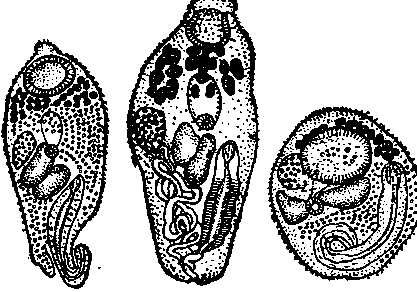 Относительное положение семенников и яичника зависит от сокращения тела, так же, как их отношение к сравнительно крупной половой бурсе. Желточники расположены впереди остальных половых органов, и лишь петли объемистой матки могут налегать на них. У типичного экземпляра с каждой стороны медианной линии тела насчитывалось по 16 фолликулов, которые образовали сплошную полосу поперек тела, позади передней присоски. Диаметр фаринкса 0,06—0,08 мм. Яйца с тонкой оболочкой, достигают 0,012— 0.015 X 0,08—0,09 мм.