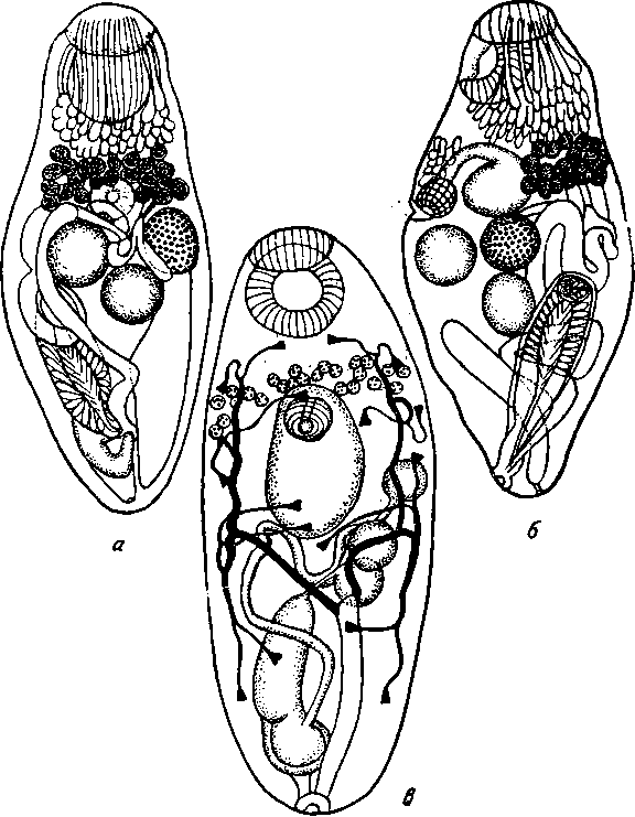 a — общий вид мариты дорзально; б — общий вид мариты латерально; в — метацеркарий с экскреторной системой, из цисты, извлеченной из полости тела Menidia sp.