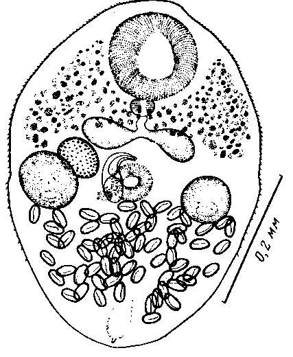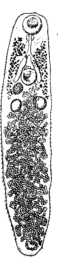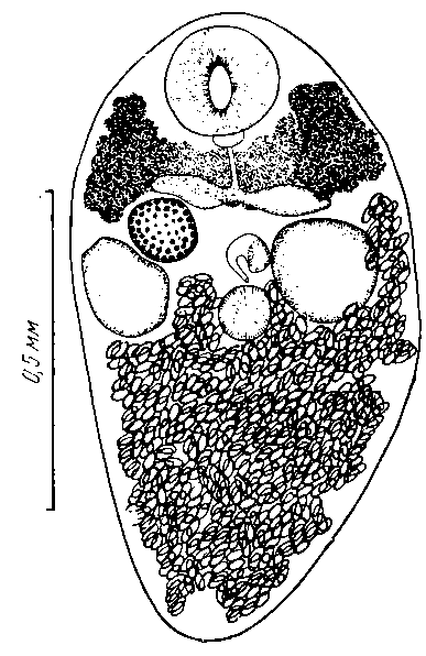 Яйца достигают 0,040—0,042 х0,029—0,031 мм. Желточники мощно развиты. Они заполняют латеральные поля тела от уровня яичника до ротовой присоски; кроме того, поперечная полоса из желточных фолликулов пересекает тело паразита в промежутке между ротовой присоской и половым отверстием. Эта поперечная полоса желточников прикрывает собою короткие кишечные стволы, направленные в латеральные стороны.