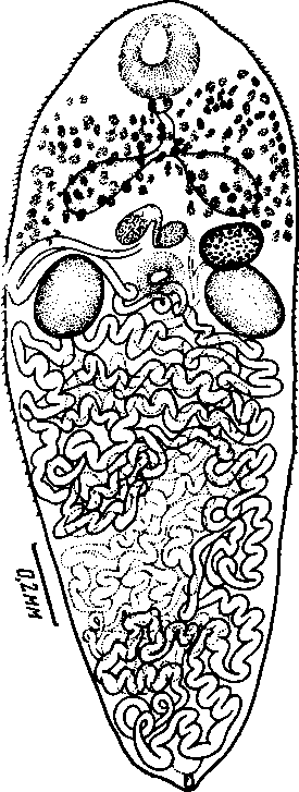 Они перекрывают собою весь пищеварительный тракт» Желточные протоки сливаются непосредственно позади оотипа, образуя маленький желточный резервуар в форме полумесяца.