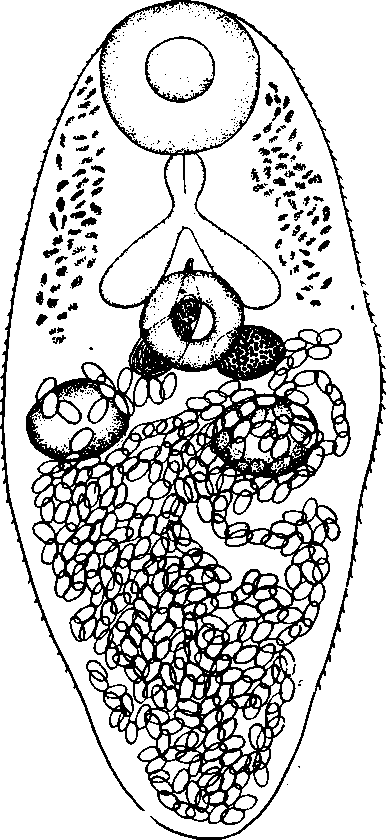 Расположение петель матки не могло быть прослежено точно, однако удалось подметить, что большинство молодых яиц находится в заднем отделе тела, тогда как зрелые яйца занимают более переднюю часть тела. Яйца с плотной оболочкой достигают 0,050—0,052x0,034x0,035мм.