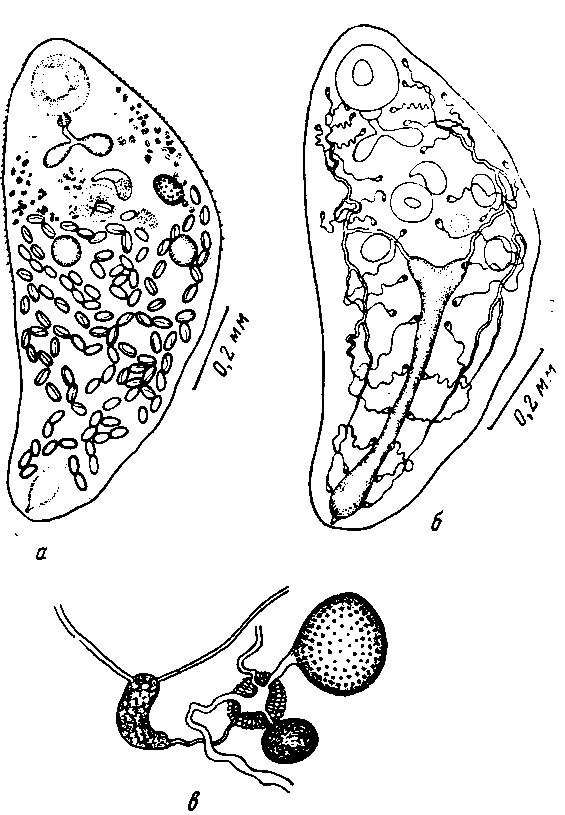 a — марита; б — экскреторная система; в — комплекс женских половых органов