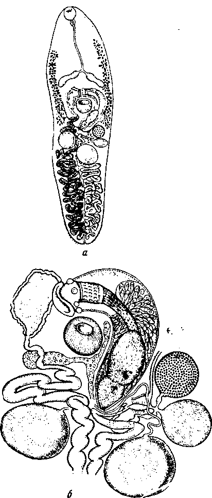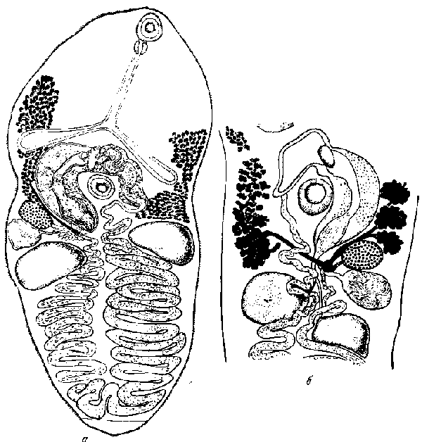 Имеются круглый фаринкс, достигающий 0,1 мм в диаметре, длинный тонкий пищевод и короткие кишечные стволы, расходящиеся по сторонам и соприкасающиеся своими задними слепыми концами с концами желточников. Экскреторный пузырь имеет форму Y, с очень длинным стволом, который только на уровне брюшной присоски подразделяется на две короткие ветви. Половое отверстие лежит медианно, несколько впереди брюшной присоски. Половая бурса утолщенная, трубковидная, суженная в области своей передней части; широкой дугой она огибает брюшную присоску, причем ее дно располагается позади присоски на значительном расстоянии.