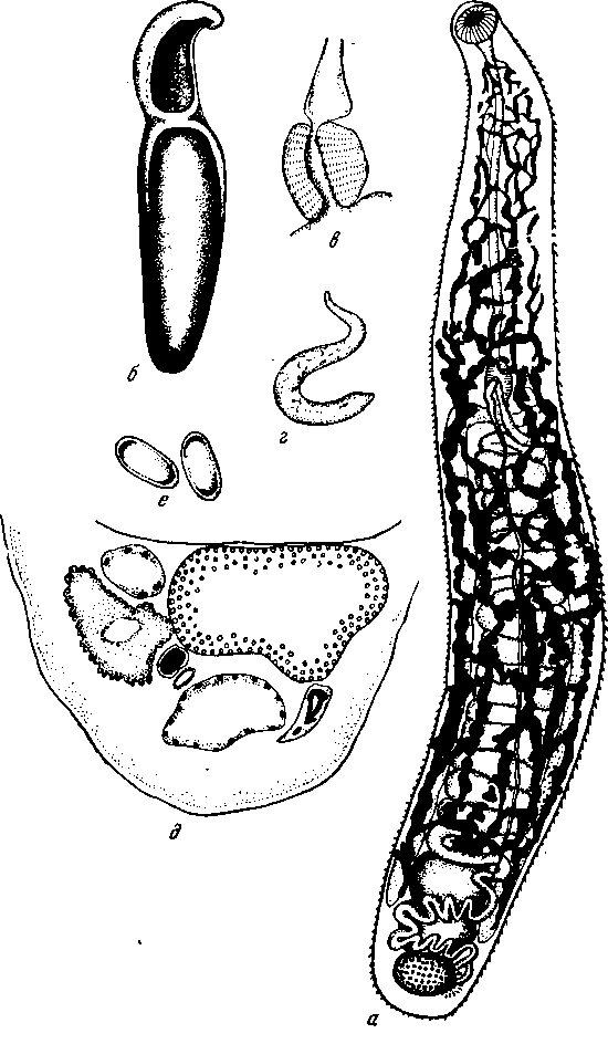 a — марита; б — марита в законсервированном виде; в — пищеводный бульбус; г— марита в живом виде; д — срез заднего конца тела мариты; е — яйца