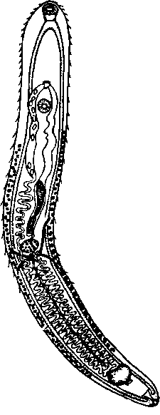 Яйца расположены по всей длине матки и даже в метратерме; они золотисто-желтого цвета, с гладкой двойной оболочкой и крышечкой на переднем конце; их размер: 0,030—0,034 х 0,013—0,019 мм.