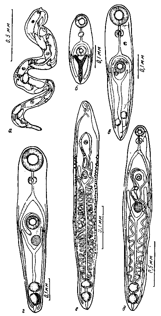 a — спороциста; б — метацеркарий; в — д — молодые трематоды; е — марита